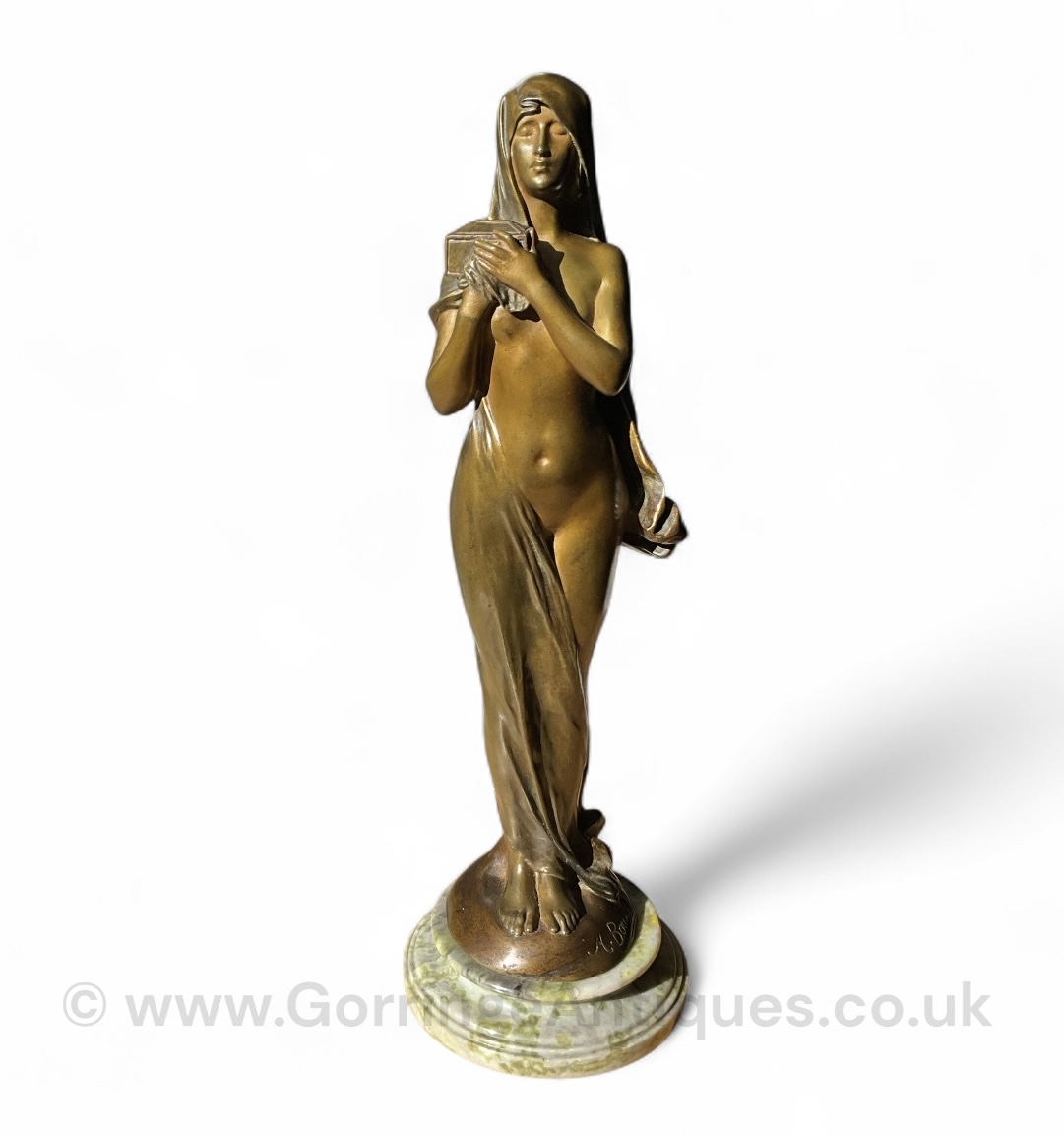 ‘Le Secret’, an early 20th-century French Art Nouveau bronze sculpture by Maurice Bouval capturing the enigmatic allure of Pandora in a semi-clad form.